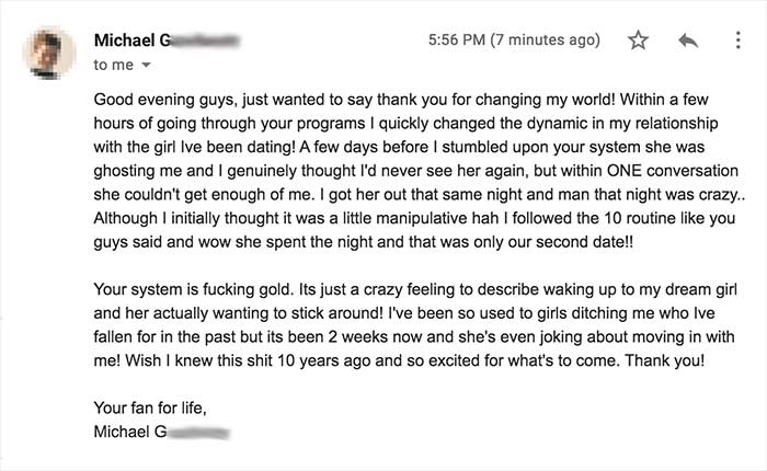 So a big big thanks from me. As hard and as painful as fuck things felt last year after losing who I thought was the girl of my dreams she’s in the past now because thanks to you now I’ve landed my ACTUAL DREAM GIRL. Ex doesn’t even come close. Just really really wish I actually picked this shit up earlier in my life so I can confidently walk into any relationship confident as fuck and if they walk out or I walk out I know I’ve got the skills to get going again. If I get rusty, I know exactly where to come again. Cheers!