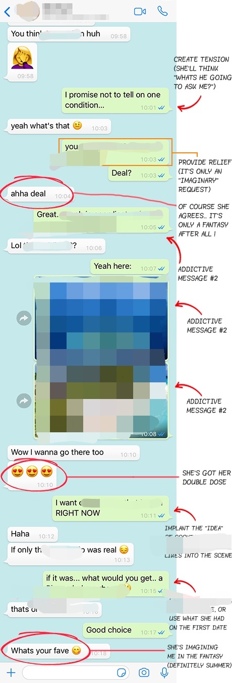 Then you’ll use “The Drama Technique” to create intense sexual tension with your very first message. This text unleashes her naughty side until she’s desperately giving away her number within just 6 simple messages.